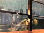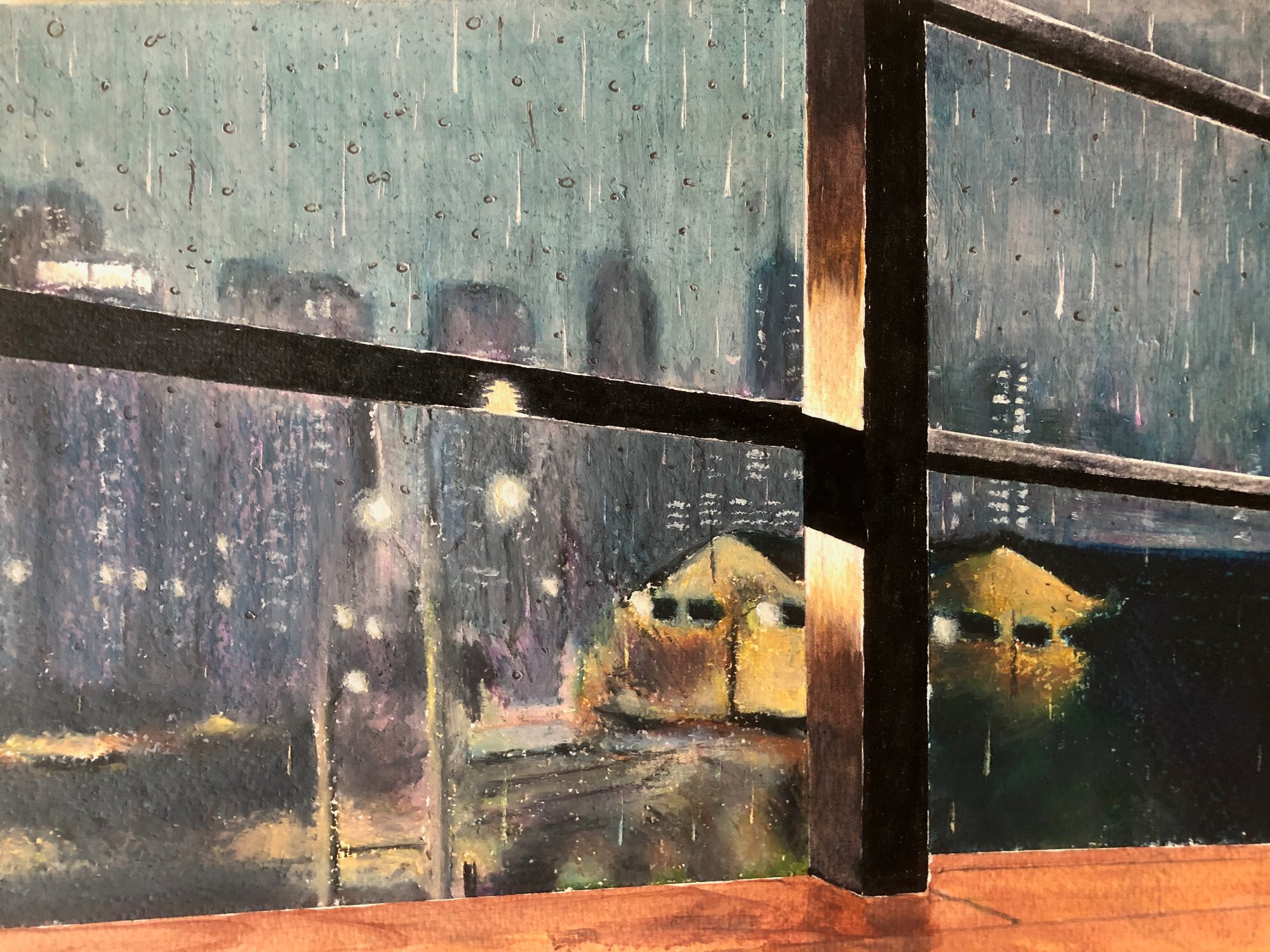 This print captures the serene beauty of a cityscape on a rainy night, as seen from the cozy perspective of a balcony. The impressionistic style uses vibrant, blurred city lights and glowing reflections on wet surfaces to create a moody and romantic atmosphere. Streaks of rain are visible on the window or glass, enhancing the cozy feeling of being indoors while the city glistens outside. This artwork is perfect for adding a touch of urban charm and a tranquil ambiance to any living room, bedroom, or office space.