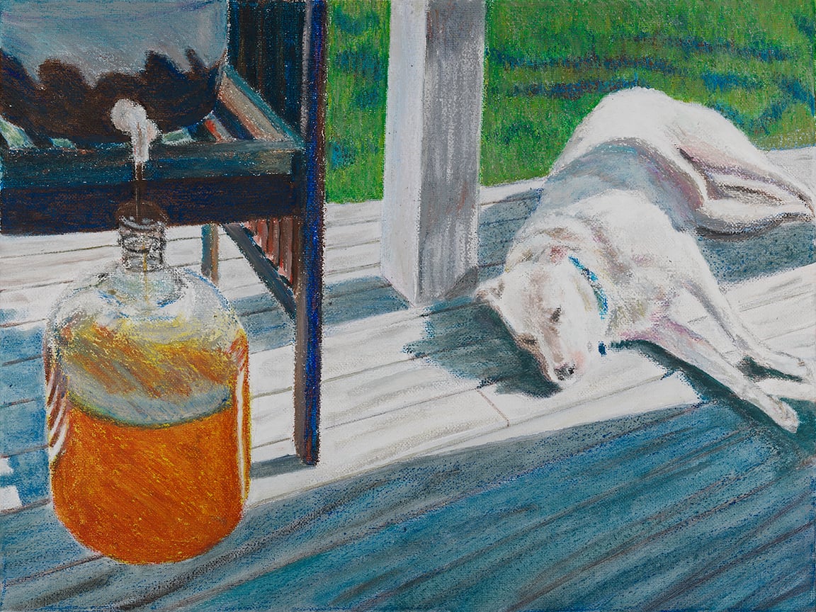 This high-quality giclee art print is a reproduction of the original "Still Life" painting by New Zealand artist Hoagy Scoins. The artwork features a serene and colorful scene, a charming still life that captures a moment of quiet domesticity.