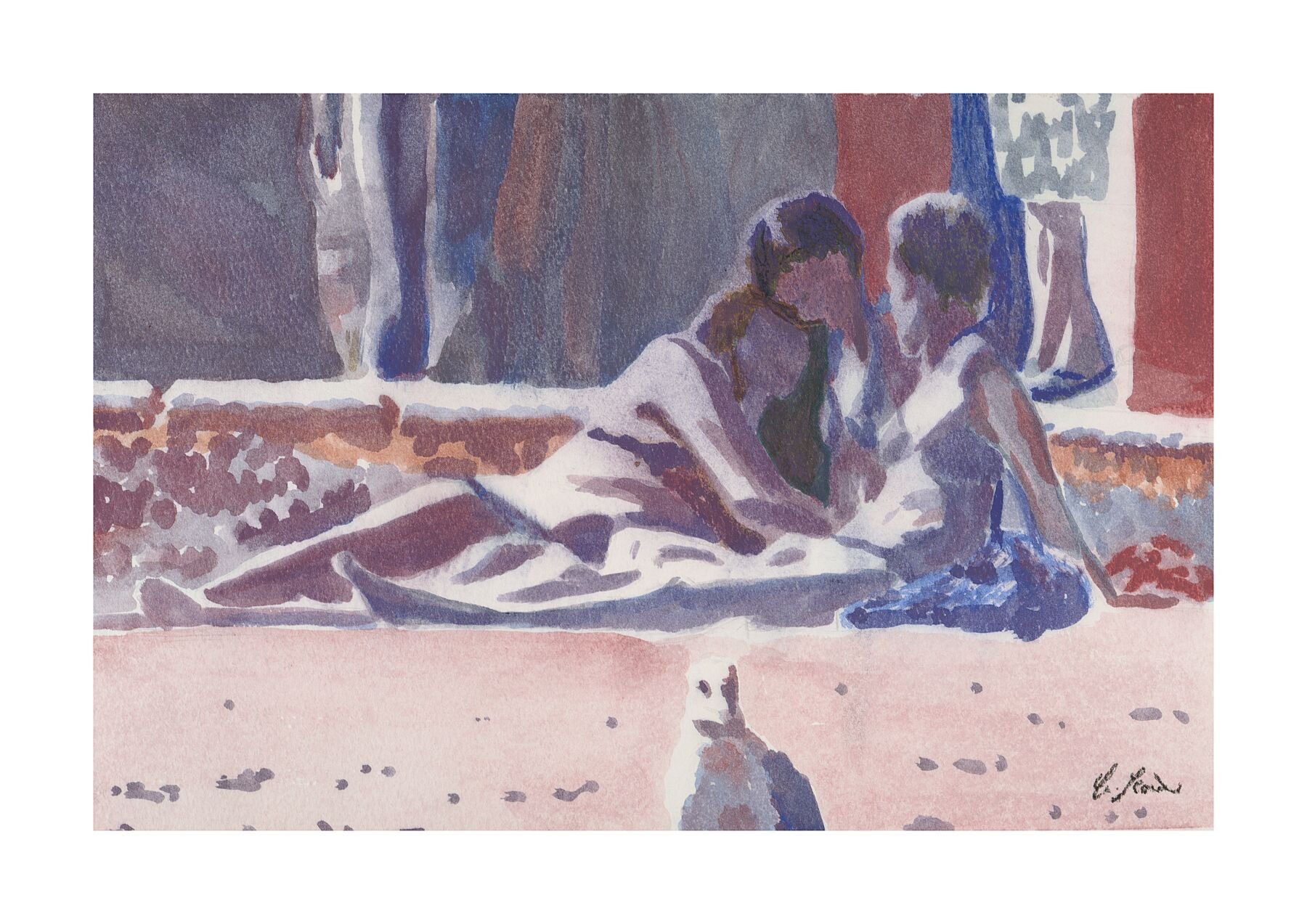 This art print is a high-quality reproduction of the original watercolour painting, "Three Girls And A Gull," by artist Hoagy Scoins. The artwork captures a serene and candid moment on a sun-drenched beach, featuring three figures relaxing near the water's edge with a curious gull in the foreground. Scoins' signature use of soft, blended colours and luminous light creates a peaceful, nostalgic atmosphere that will add a sense of calm and seaside charm to any space.
